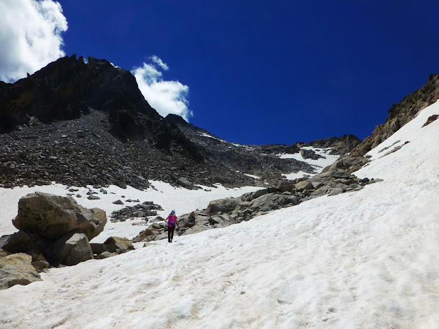 Vista de la normal del Neouvielle antes de remontar a la brecha de chausenque. Todavía hay nieve pero en horas tardías no son necesarios crampones ni piolets.