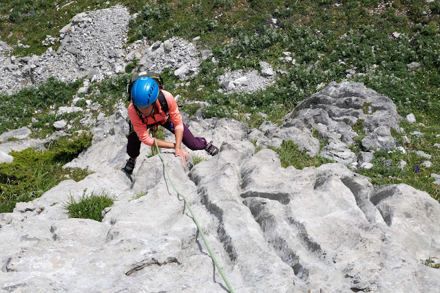 El pasado fin de semana aprovechamos la ocasión, y subiendo con la calma, escalamos por la tarde "Regaliz". Una vía bonita, aunque bastante discontinua, con una primera parte de resaltes fáciles y tramos de andar. Y una segunda parte con 3 largos más difíciles, mantenidos e interesantes.